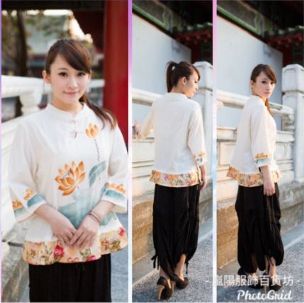 現貨下單送耳環 手繪蓮花七分袖手染服中版上衣 原胚棉女款唐裝破盤中袖中國風嵐陽服飾揚琴樂團古箏演出旗袍上衣新年